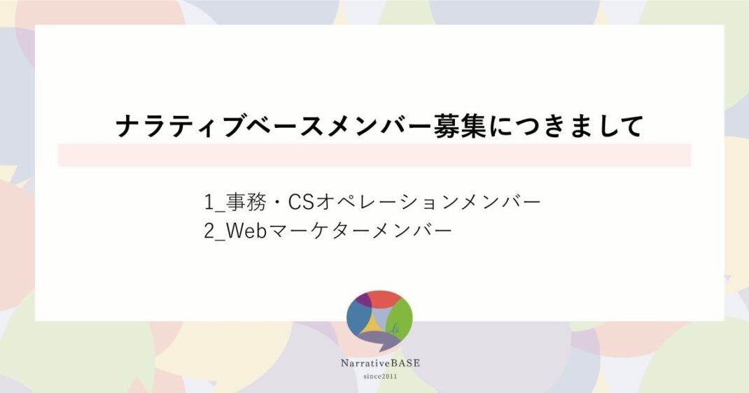 株式会社ナラティブベースでは、この度業務拡大のためナラティブベースのメンバーとして(フリーランス・個人事業主への業務委託)一緒に働いてくれる仲間を募集します。ご興味のある皆さまからのご応募をお待ちしています。